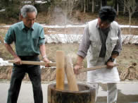 餅米が炊きあがり杵で餅米の粒をつぶしているところです。