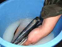 (たわしで尾の方からうろこを落とすように洗ってから3日間米のとぎ汁につけてもどす)