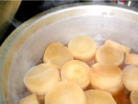 大根を輪切りにし皮をむき角をとり、味付けをしていく。