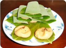 5. まるめてゆべし型につくり笹に包んで蒸し器で約20分蒸す。