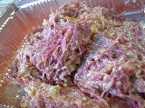 「もってのほかおいしい~」が由来といわれる『もって菊』や『黄菊』など、食用菊にもいろいろな種類があります。料理はおひたしが一般的ですか、これは酢+くるみぬたの和え物。くるみ和えだけでもおいしいですが、酢が入るとさらに苦みが薄れ、箸が進みました。