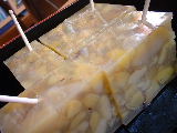 秋に収穫した栗を湯がいて冷凍したものを寒天にしたおやつです。つるりとした舌触りの後に、栗が口の中でほくほくとほどけて、甘い風味が広がります。