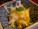こちらは大根と合わせた酢の物です。白と黄色のコントラストと、それぞれのシャキシャキ感。素材の相性がいい一品です。