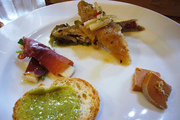 写真は前菜として特別に出して頂きましたものです。手前のフランスパンは、1月頃から出荷が始まっている「フキノトウ」をペースト状にしたものです。香り豊かで独特の苦みがいいですね。