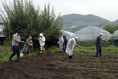 スローフード山形ブロックでは、そば好きの有志が集まり、そば作りを楽しむ事になりました。そばを蒔いて、そばの実を収穫し、そば粉に挽き、そばを打って食べるという一連のそば作りです。第1弾として8月4日、台風が通過中の小雨降る、あいにくの天気の中、山形市の西方、本沢地区長谷堂のそば畑で、そばの実を蒔きました。