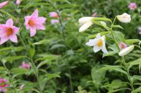 淡いピンクのヒメサユリが咲き競う花園の一角に、ちょっぴり控えめに咲き始めの純白ヒメサユリが有りました。目立たず、おしとやかでいながら、どこと無く上品な姿はまるで里山の妖精でした。その数は極めて少ないです。