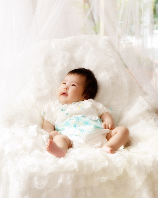 真っ白な空間に包まれ、赤ちゃんらしい神秘的なシチュエーション。また後ろには緑があり、すくすくと成長を意味しております。これからますますの成長お祈りいたします。