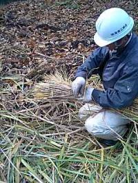 吹雪が吹き込んでくる茅屋根の隙間を藁で塞ぎます。