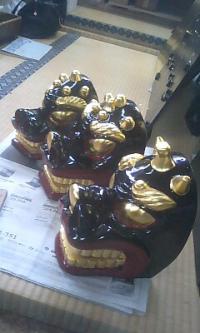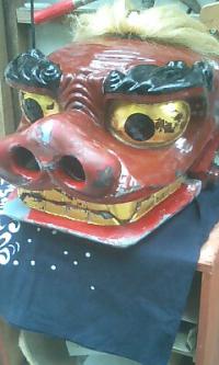 満身創痍の古い獅子頭です。 顎が割れあちこちひび割れが目立ち塗装も 剥がれています。 依頼を受けてお寺にお迎えに行くと 制作された年号は記録してきませんでしたが 川西町で一番古い獅子とか・・。 正確に言えば寺には二頭の獅子がありこの獅子頭より 一回り大きく重い獅子がありそちらが古く、江戸時代の 年号が記されておりました。 そちらも以前飯豊町の小屋の渡部氏が修理したと 獅子に記録されていました。 少し前長井の五十川(いかがわ)の獅子舞を 習ったという住職さんのお話をお聞きしました。 偶然・・五十川の獅子頭は只今制作中ですが 似ても似つかぬ形です。 推測ですが、五十川の隣の白鷹町浅立の諏訪神社の 獅子頭に色形が似ています。 獅子舞も何かの縁あって伝授されたのではないでしょうか? |
