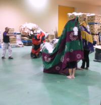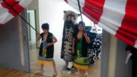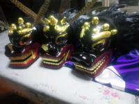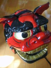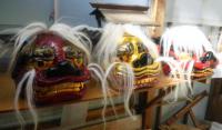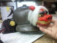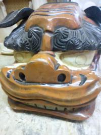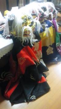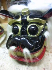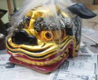 獅子舞なので三頭獅子でしょうか? 四方山会40周年記念公演で御披露目する獅子を整形し 仕上げております いろいろ考えて、こんな形相になりました 昨日は左の赤いちゃんは白目でした 今日は金目に変更 タバコくわえている様ですが違います 鼻先はまだ赤いまま そして今日・・右の金獅子と赤獅子に習い鼻を黒くしました 金獅子にも細長い髭をくわえたところがミソです 獅子幕も三頭三様に現在制作依頼中 タテガミも完成し尻尾制作を試案し苦悩しております 完成ご期待下さい でも黒獅子ファンの方にはどうかなぁ〜?? お気に召さない様な気配です |