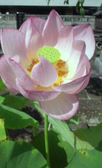 毎年大きな蓮の花が咲くのでお墓参りの密かな楽しみの一つです 今年は例年より更に大きく見事に咲き、お墓が並ぶ風景に 神々しい彩りを放っています 道端のひまわりやマリーゴールドには作れない雰囲気ですね‥ 花の中央には蓮、独特の漏斗状の雌しべ?があります 少しグロテスクな形だとおもいませんか? 花が落ち、丸い実が漏斗の穴に収まって成長するのですが‥ 悪く言えば不気味 やはりただ者ではない花なのでしょう 数千年前の実が遺跡から発見され、栽培され現代に蘇るなんて生命力も秘めな がら、根はレンコンとして食用にもなる訳ですからね‥ そうです あの丸い水を弾く葉も工業技術に応用され撥水性の化学繊維に活かされている と聞きました 赤湯の清文さんではお盆のお供えグッヅ用に販売されておりました 蓮の茎にも驚かされます 大きな葉や花を支える構造はどうなっているのでしょうか? 仏様お気に入りの蓮には、まだまだ隠れた活用法があるのかも知れませんね |
