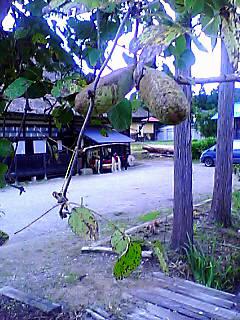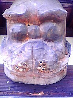 毎年よりによって鼻の穴にですよ。獅子宿の玄関中央に飾ってある出来そこないの獅子の木地に蜂が巣をつくるんです。勝手に穴まで開けて大改造してるんです。以前玄関に木の桶を飾っていたら野生の蜜蜂が巣をつくって蜜がダラダラ流れてきたんで、知り合いが夜ソーッと桶ごとビニールに包んで誘拐したんです。結局、誘拐先で箱をワザワザ用意して育てようとしたんですがすぐに集団夜逃げしたんだって。何でも人間の思い通りにはならないってことです。
