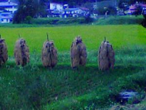 収穫後の田んぼに立っているカカシのようなもの。伊達に立てているわけでなく、ご存知のように稲の乾燥であります。でも、雨にぬれても傘を持たせるわけでなく、濡れっぱなしです。あれでホントに乾燥すんのかなぁ?じっと見ていると何故か蓑を着たおじいさんかおばあさんに見えてきました。
