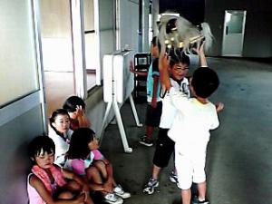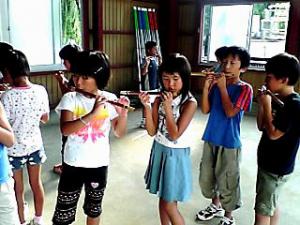 みんな笛を持つのも初めて。小さな指は笛の穴にスッポリ入ってしまいます。音なんかまだまだでませんが、どう教えれば音がでるか!研究です。空のガラス瓶に息を吹きかけて息の出しかたを工夫させるのはどうでしょうか?
