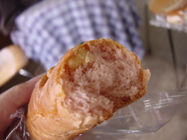 木村家さんの紅麹パン。外見は、普通のコッペパンみたいなので、割ってみました。すると、ピンク色。イチゴ味ではありません。念のため。シンプルな食事パンで、なんにでも合いそう。