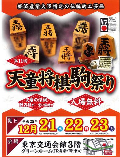天童の伝統匠の技が一堂に集結します! 期 日 : 平成25年12月21日(土)・22日(日)・23日(月) 会 場 : 東京交通会館3階 グリーンルーム(JR有楽町駅東口) 催し物 ・ 天童将棋駒展示 → 天童名産の将棋駒やグッズが勢揃い! 豊富な中から手にとってご覧いただけます。 ・ 将棋駒製作実演 → 書き師、彫り師の熟練した技を目の前でご覧になれます。 ・伝統工芸士逸品の展示 → 天童将棋駒伝統工芸士の作品を展示します。 ・書き駒の体験教室 → 自分オリジナルの将棋駒を製作できます。 ・プロ棋士との指導対局 → 女流棋士による指導対局 ※指導対局希望の方は、事前に組合までお申込下さい。 受付は12月2日(月) 〜 9日(月) 平日の9:00〜17:00まで。 抽選のうえ決定し後日直接ご通知致します。 21日(土) → 甲斐 智美 女流王位 1回目 PM2:00〜3:00・2回目 PM4:00〜5:00 22日(日) → 上田 初美 女流三段 1回目 PM2:00〜3:00・2回目 PM4:00〜5:00 23日(月) → 石高 澄恵 女流二段 1回目AM11:00〜12:00・2回目PM1:00〜2:00 |