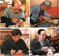 [画像]木地師なた一丁で、荒削りから仕上げまでおこないます。 ▼[画像]書き師自慢の筆で、うるしを鮮やかに書いてゆきます。 ▼[画像]彫り師ノミ一本で文字を書くように彫り込んでゆきます。 ▼[画像]盛り上げ師名人戦にも使われる天童駒の最高級品です。彫り埋め研ぎ出した駒に、さらに文字を漆で浮き出させていきます。