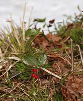 そんな雪をバックに赤い実をたたえるヤブコウジ。