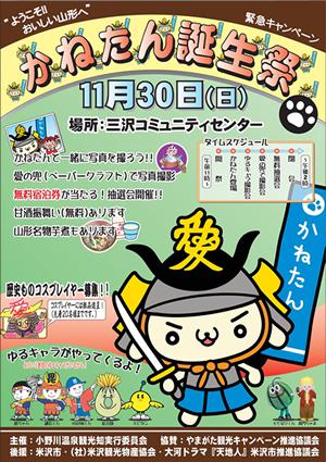 イベントでは、かねたんの紹介のほか、写真撮影会、甘酒振舞や芋煮や弁当の販売、愛の兜のペーパークラフトで写真撮影、小野川温泉の無料宿泊券が当たる抽選会を行います。