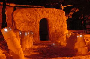 昨日完成したばかりのかまくら。夜には『地球にやさしい雪ぼんぼり』が道を照らしだします。