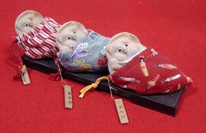 信楽たぬき三兄弟です。寝袋に入って、おやすみ間際です。