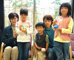 三人で描いた鈴を持っての記念写真。