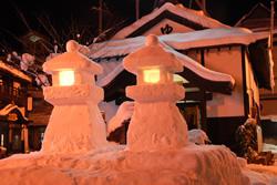 小野川温泉でも温泉街のシンボル尼湯前に雪灯篭が2基作られています。