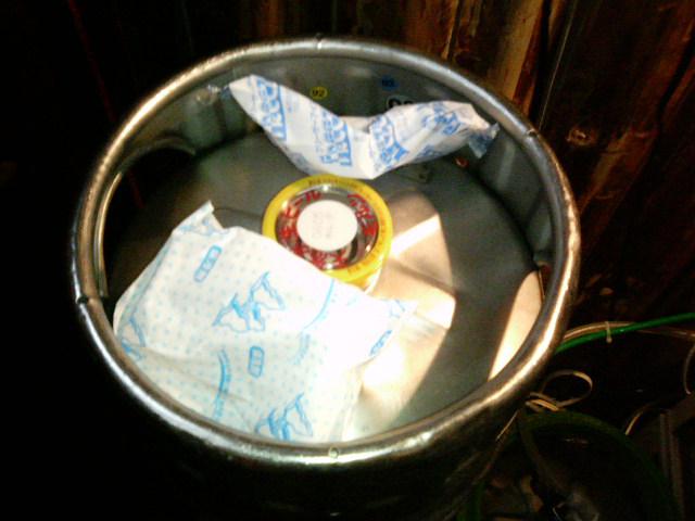 毎日、樽の温度を計りガスを調整してますがこの季節になるとどうしても樽の温度が上がってしまいます。そこで一アイデア☆樽に保冷剤を置き樽の温度を下げます。そのため夏でもおいしい『生』が飲めます。隠れたところでの努力、これ絶対大事!