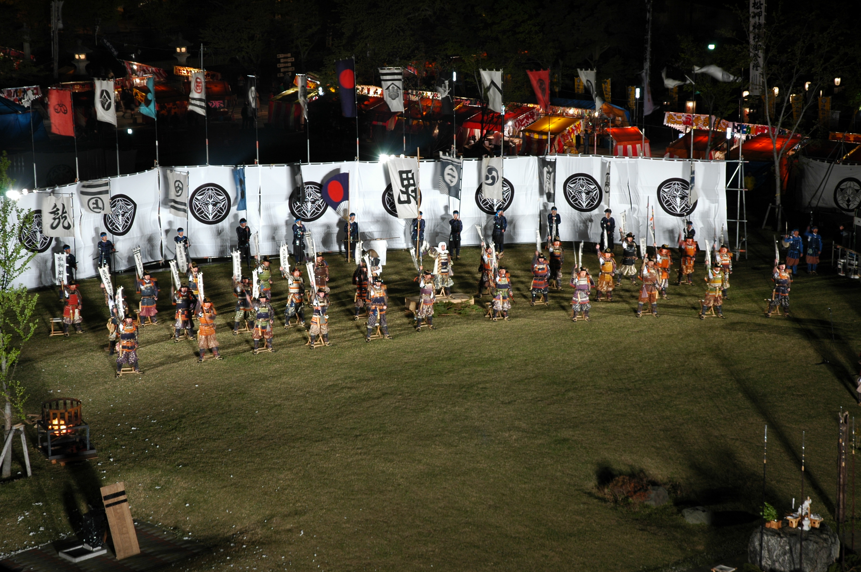 赤々と燃えるかがり火の中で、五沾水(ごてんすい)の儀・軍神勧請の儀、上杉鉄砲隊の発砲、上杉太鼓の披露などが約1時間にわたって荘厳にとり行われ、つめかけた観客をしばし戦国の世へ誘います。
