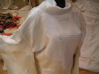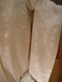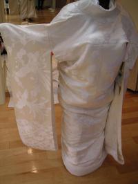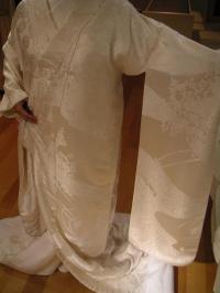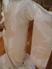 衣装屋さんが出してくれたのは「御所車」「鶴」「鳳凰」の3着。 白の色味と柄による雰囲気の違い(華やかさ・清楚さ・可愛らしさ・シック・正統派…など)で選ぶのですが、微妙な違いで意外と時間がかかりました。 白無垢「鳳凰」前 |