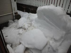 今朝、裏口から外に出てみると雪の塊が隣家との境にドサッと。裏口の屋根に積もっていた雪が昨日の雨で解けて落ちてきたよう。人にあたったら危ない量です。火災保険をご契約いただいているお客様からも落雪により塀が倒れた、エアコンの室外機がつぶれたとの連絡が入りました。今年の大雪は多大な雪害被害を生みそうです。毎年多いのは雨どいの破損。これらももちろん雪害対象となります。