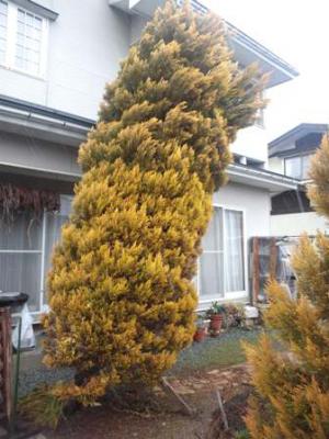 写真は昨夜の風で45度傾いてしまった我家のゴールドクレスト。 |