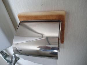 昨日の日曜日、残務整理のために事務所に。翌日月曜日は私のトイレ掃除当番の日であることを思い出し、先にやっておくことに。拭き掃除をしているとトイレットペーパーホルダーがやたらガタついています。以前より気になっていたもの。止めネジを受ける壁が空洞状態で押さえが効いていません。自宅に戻り板を準備しそれを壁に打ちつけ、その板にペーパーホルダーを固定。完璧な出来栄えです。
