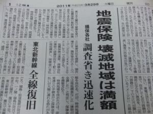本日の朝日新聞に「地震保険 壊滅地域は満額」というタイトルで記事が書かれていました。阪神大震災の783億円を大幅に上回るだろうと推測されている今回の地震保険の支払いのために損保各社は全国から査定スタッフを集め緊急対応を進めています。各代理店には地震保険契約お客様のリストが送られてきて、全ての契約について損害状況の確認をしたところです。山形地域においては幸いに大きな被害を受けたお客様はおられません。しかし、岩手県、宮城県においては壊滅的な被害を受けた地域が広範囲にあります。一軒一軒の確認は困難。そういった特別地域においては、衛星写真で確認しながら「建物が全壊した」と判定して保険金を満額支払うと記事に書いてありました。