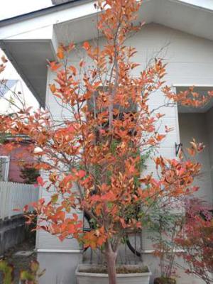 今朝、目を覚ますと、ここ数日間感じていた胸のざらつきがない。薬を飲んで5日目、やっとかぜが治ったよう。さっそく戸外に出て軽い運動を。今度の日曜日は「星ふるロード」マラソン大会。ゆっくりと足の筋肉を伸ばしました。しばらく練習はできなかったけれどもその分、ひざの痛みも消えています。あとは体調を整えマイペースで完走を目指すのみ。玄関前のシャラがすっかり紅葉していました。