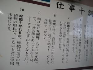 昨日お伺いしたお客様の事務所に「仕事十訓」と書かれたボードが壁にかけられていました。「大きな仕事をしなさい、小さな仕事をしていると人間も小さくなる」などなかなか意味深いことばが。その十番目には「摩擦を恐れるな。摩擦は進歩の母、でないと君は卑屈になる」と。なかなかスルドイご指摘ではないかと事務員さんに問いかけると「摩擦を恐れたことはない」とのこと。恐れ入りました。
