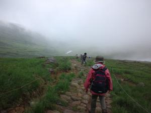8月15日は朝食後に雨具をザツクに詰め込み月山へ。妻を連れての山登り。スタートがやや遅れたため山頂へは午後1時着予定。リフトを降りて姥ケ岳から金姥をとおり牛首まで。いよいよ登りに入ろうとしたときに雨が。準備した雨具を着たもののかなり激しい。あっさり登頂を断念。下り始めしばらくすると雨も小降りに。これから登ろうとする人たちもいましたが目もくれず一気に下って来たのでした。
