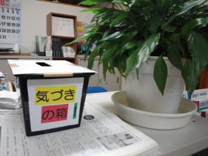 前回の土曜ミーティングで『気づきの箱』を提案しました。日本レーザーの近藤宣之社長の講演を聞いて思いたったもの。まだ何もしていなかったことに気づいた!100円ショップに行き手ごろなBOXを購入。やや小さめだがなんとかなるだろう。精度よりは一歩のアクションを起こすことが大事。その天井にボール紙を張り『気づきの箱』の張り紙を付けて出来上がり。どんな気づきが出てくるか楽しみです。