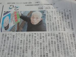 今日の朝日新聞の「ひと」の欄に94歳で衆議院選挙に立候補した川島良吉さんのことが載っていました。党首討論の中で「国防軍」や「憲法改正」ということばが飛び交っているのを見て、かつて中国戦線で仲間が次々に死んでいくのを見た者として立ち上がった。供託金の300万円は葬式代としてためていた分をあてたと。結果は2169票という結果でしたが大きな一石だったのではないでしょうか。