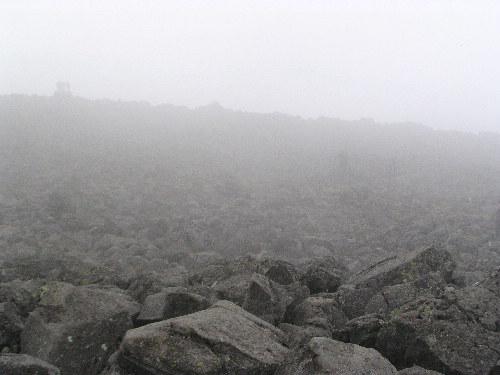 せっかくの山頂はガスがかかって期待のアルプスは見えません。おまけに寒くて大変でした。