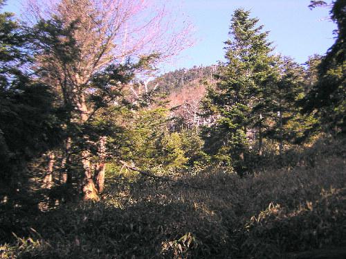 稜線の鞍部からコメツガとシラビソの中を山頂めざして登ります。
