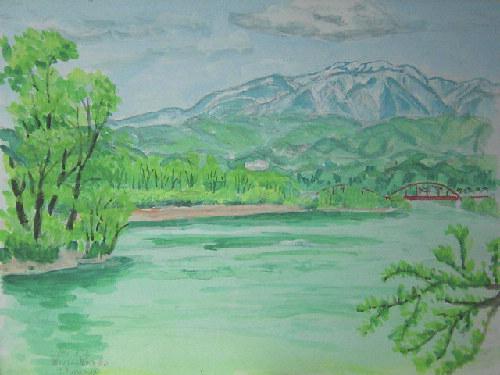 ▼早春の最上川と葉山(水彩画)