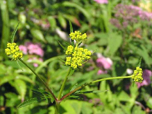 秋の花であるオミナエシがもう咲いていました。バックに写っているピンクはシモツケです。