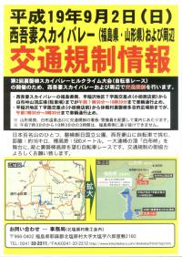 「西吾妻スカイバレー」が 9月2日(日)午前7時30分〜10時30分の3時間 通り抜けできなくなります。 第2回裏磐梯スカイバレーヒルクライム大会(自転車レース)開催 のため交通規制をおこないます。 福島県側、早稲沢地区T字路交差点(小椋商店)から 白布峠山頂広場(駐車場)までが午前7時30分〜10時30分 まで車両通行止め 早稲沢地区T字路交差点(小椋商店)から休暇村裏磐梯多目的広場前 までが、午前7時30分〜8時30分まで車両通行止め ※山形県側、白布温泉出口に交通規制の看板,警備員配置して案内にあたります。 ※午前7時30分から10時30分の3時間は、福島県側に通り抜け出来ません。 日本百名山のひとつ、磐梯朝日国立公園、西吾妻山に自転車で挑む、距離約10K 標高差550M。一大連峰の頂「白布峠」を舞台に、湖と裏磐梯高原を望む自転車レースです。交通規制のご協力よろしくお願いいたします。 お問合せ スカイバレーヒルクライム事務局(北塩原村商工会内) 〒966-0402 福島県耶麻郡北塩原村大字大塩字六郎屋敷2160 TEL0241-33-2311/FAX0241-33-2312 http://www.kitashiobara.com/shokokai/html/top.html |