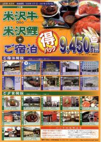 昨年より、ビジネスの方、旅行のお客様に大好評を得ております、 「米沢牛・米沢鯉宿泊マル得パック」が9月1日(金)より、新しくスタートいたします! これは、市内のホテル、旅館に宿泊して、米沢牛か米沢鯉の夕食を指定の食事処から選んで、宿泊と夕食をあわせて9,450円という大変お得なパックです! すべて観光物産協会会員のお店ですので安心で安い! 旅行だけでなく、ぜひビジネスで米沢にお越しの方もご利用下さい! 期間は9月1日(金)より平成19年8月31日まで こちら米沢観光物産協会内のページでも各お店のホームページにリンクしてありますので詳しくご覧になれます。 注意事項 ◇1室1名様よりご利用いただけます。 ◇宿泊は10軒のホテル、旅館よりお選び下さい。夕食は12軒よりお選び下さい。 ◇マル得パック以外の酒類、料理、その他のサービス等を追加された場合には ご利用店にて別途ご精算いただきます。 ◇お盆、正月、まつり催事開催時などの繁忙期にはお断りする場合もございます。 ◇ご予約はご旅行日の2日前までにお願いいたします。 ◇現金のみのお取り扱いとさせていただきます。 キャンセルについて ◇キャンセルが発生した場合にはそれぞれの宿泊施設の規定によります。 ...もっと詳しく |