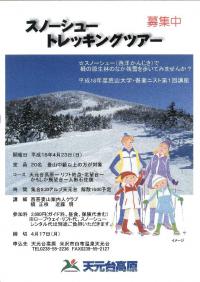 天元台高原のツアー募集です。 スノーシュー(西洋かんじき)で栂の原生林のなか残雪を歩いてみませんか? 開催日 平成18年4月23日(日) 定 員 20名 登山中級以上の方が対象 コース 天元台高原〜リフト終点・北望台〜かもしか展望台〜人形石往復 時 間 集合8時30分アルブ天元台 解散16時予定 講 師 西吾妻山案内人クラブ 槙 正枝氏 近藤 明氏 参加料 2,600円(ガイド料、昼食、保険代含む) ※ロープウェイ・リフト代・スノーシューレンタル代は別途ご負担いただきます。 締切り 4月17日(月) 申込先 天元台高原 米沢市白布温泉天元台 TEL0238−55−2236 FAX0238−55−2127 |