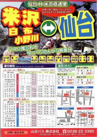 山交バス 米沢(白布・小野川)⇔仙台直通便 通常の米沢⇔仙台便を更に延長して小野川、白布まで直通で運行! 4月1日から11月30日までの運行となります。 仙台から白布小野川温泉にお越しの際はぜひご利用下さい! 便利で、ゆったり快適な旅をお過ごし下さい。 本数 仙台⇔米沢 1日6便 内 小野川白布直通便は1便(仙台駅発14:00)(白布発10:15) 乗車時間 仙台駅〜米沢 2時間 〜小野川 2時間20分 〜白布 2時間40分 運賃 仙台⇔米沢 片道1800円 往復3200円 仙台⇔小野川 片道1900円 仙台⇔白布 片道2100円 詳しい時刻表については 山交バスホームページをご覧下さい。 |