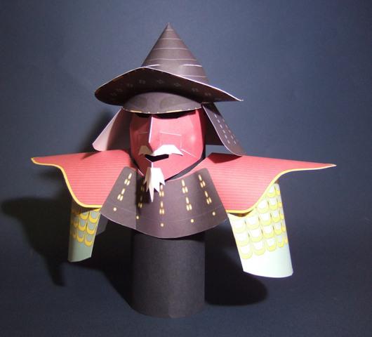 前田慶次郎の兜(「南蛮笠形兜」米沢市・宮坂考古館所蔵)のペーパークラフトです。画像は縮小版です!!南蛮笠の兜に裃のような肩当、鱗形袖と…傾奇者にふさわしい異風ないでたちのヨロイです!!