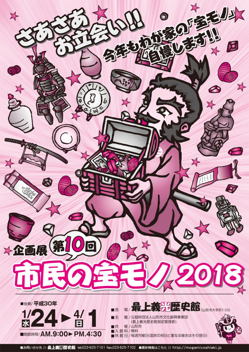 この展覧会は、山形市民を対象に、所蔵する「宝モノ」を募集して、最上義光歴史館の展示室に展示し、広く一般に公開する市民参加型の展覧会です。出品に関しては自薦他薦を問わず、また、洋の東西・時代・評価額・文化財としての価値なども一切問いません。自慢の「宝モノ」を募集し紹介するものです。今回は記念すべき10回目の開催です。おかげさまで10年続けることができました。今年も「宝モノ」を幅広いテーマで募集し出品者の「宝モノ」に対する思いやエピソードなどを紹介しています。宝モノの名称やコメントは出品者にお願いしました。 自慢の宝モノと宝モノがもつさまざまなエピソードをご覧ください。
