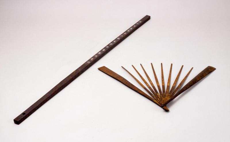 Passed down through the Mogami family, these two implements of warfare were used by Yoshiaki himself. The iron baton is 86.5 cm in length and weighs 1750 grams, making it as heavy as two swords. Inscribed on the surface of the baton is “Descendant of the Seiwa Emperor, Lord of Yamagata in Dewa, the Monk with Hair, Yoshiaki”, indicating Yoshiaki’s lineage and honorary title and attesting to his devout nature. Although the iron fan would originally have had a covering, this cover has been lost through the years, with only the iron spokes remaining. Weighing 575 g, this fan could be used not only as an actual fan, but also as an offensive weapon as well as for deflecting swords and arrows.(L)